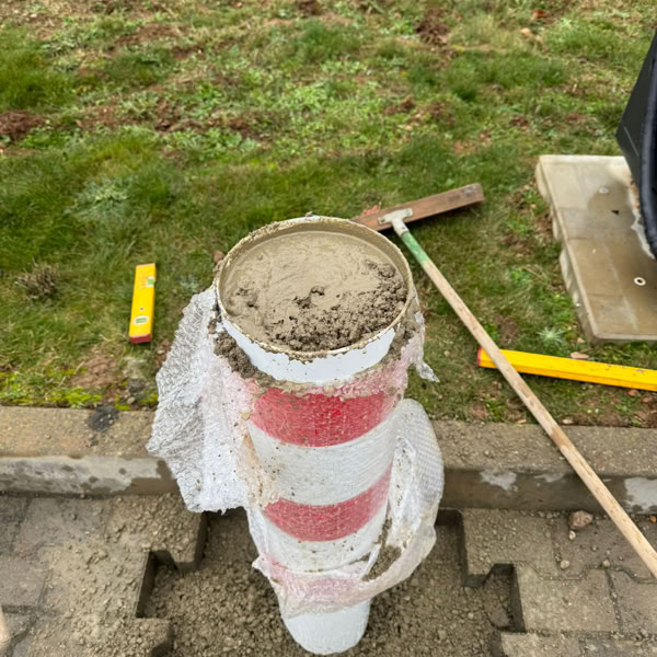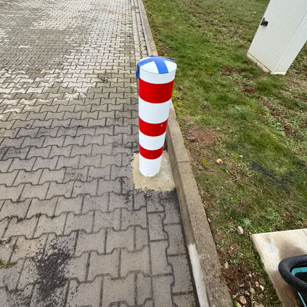 Zum Schutz der neu installierten Stromladestation für LKW wurden zwei robuste Stahlpoller eingebaut. Die Poller dienen als physische Barriere, um Beschädigungen durch rangierende Fahrzeuge zu verhindern und die Sicherheit der Ladeinfrastruktur zu gewährleisten.